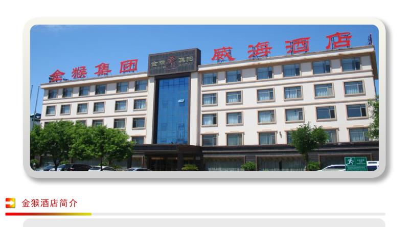 ★金猴集團(tuán)威海酒店座落于威海高技術(shù)產(chǎn)業(yè)開發(fā)區(qū)丹東路88號,是金猴集團(tuán)下設(shè)的全資子公司,酒店于05年6月營業(yè),是以餐飲、客房、會議為主體的掛牌三星級旅游飯店,同時擁有“全國工業(yè)旅游示范點(diǎn)”、“黨政機(jī)關(guān)定點(diǎn)接待飯 店”、“山東旅游服務(wù)名牌”、“威海市優(yōu)秀旅游飯店”四項(xiàng)行業(yè)榮譽(yù)。