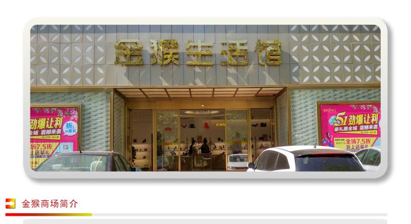 ★較高的人流使金猴購物廣場成為威海購物的黃金地段。目前入駐納迪亞、三番、特步、喬丹、361度等國內(nèi)外知名運(yùn)動品牌,形成威海市裝修、環(huán)境、鋪貨的運(yùn)動休閑一條街。