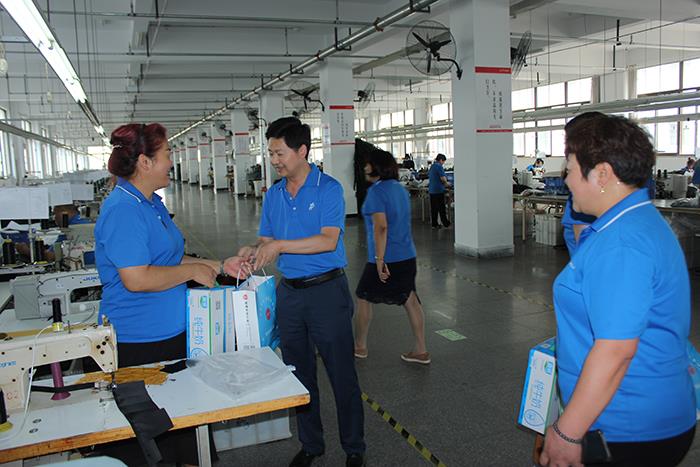 在發(fā)放慰問(wèn)品的同時(shí),鄒主席還與部分皮具公司的干部職工進(jìn)行了交談,代表工會(huì)組織向一線職工致以崇高敬意和親切慰問(wèn),并督促皮具公司落實(shí)好各項(xiàng)防暑降溫措施:一要營(yíng)造良好工作環(huán)境,優(yōu)化配置生產(chǎn)流水線,保持車(chē)間寬敞明亮通透;二要加大技術(shù)改造力度,采購(gòu)先進(jìn)生產(chǎn)設(shè)備,降低職工的勞動(dòng)強(qiáng)度;三要科學(xué)安排生產(chǎn)進(jìn)度,如遇極端高溫天氣,可安排職工下午避暑休假;四要全面加強(qiáng)人文關(guān)懷,購(gòu)置安裝大型電風(fēng)扇,發(fā)放綠豆湯和雪糕,及時(shí)補(bǔ)充車(chē)間藥箱里的藿香正氣水等防暑降溫藥品。