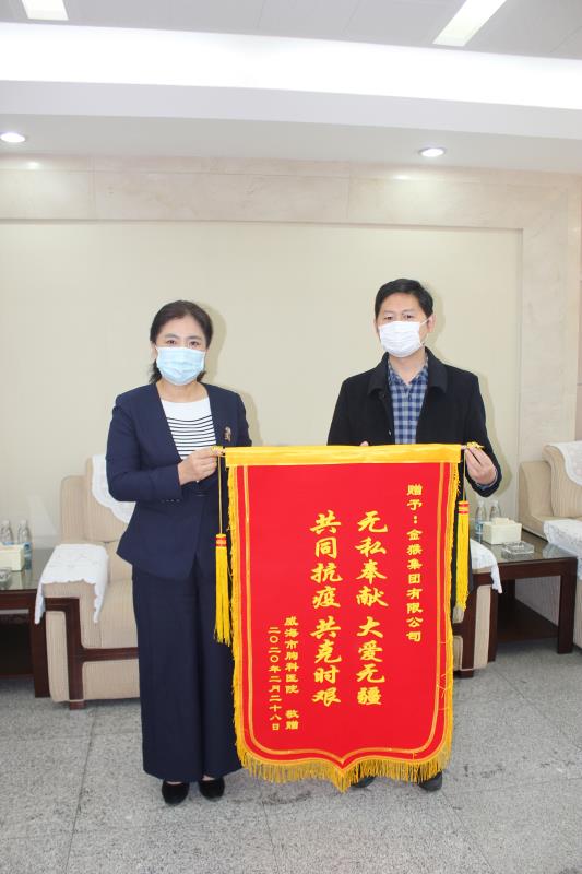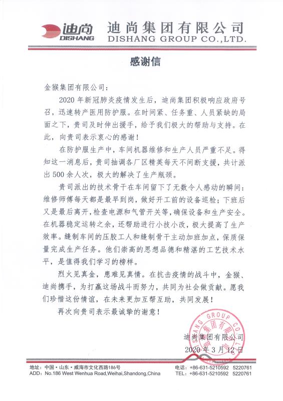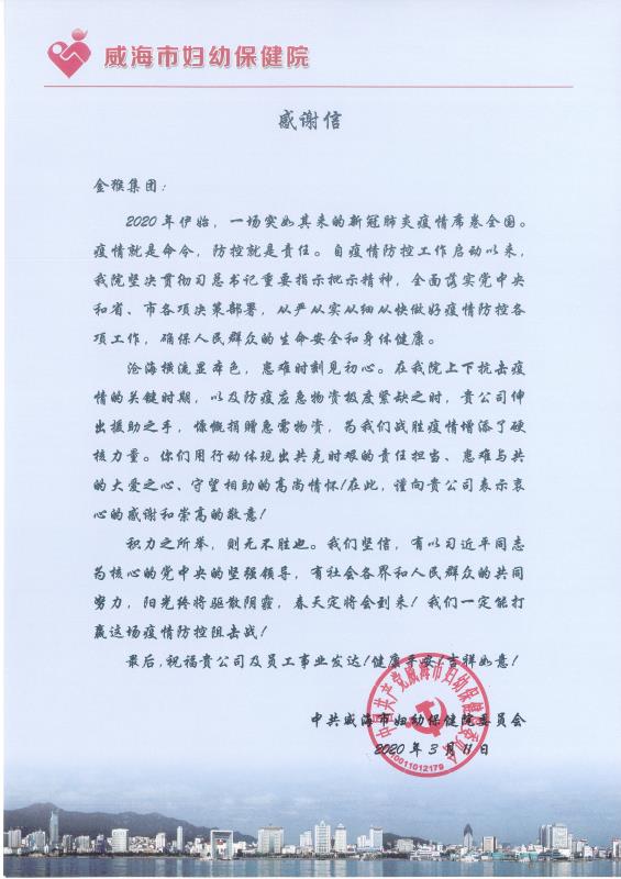 近兩月來,威海市委市政府及5區(qū)2市主要領(lǐng)導(dǎo)先后給集團(tuán)董事長打電話稱贊金猴集團(tuán)在抗擊新冠病毒戰(zhàn)役中的慈心善舉,婦幼保健院赴武漢醫(yī)療隊、威海胸科醫(yī)院、環(huán)翠樓街道商圈黨委、迪尚集團(tuán)等單位還給我公司送來感謝信和錦旗,對我公司積極出錢出人出物資全力支持部隊、地方政府、衛(wèi)生系統(tǒng)打贏疫情阻擊戰(zhàn)表示欽佩和感激。