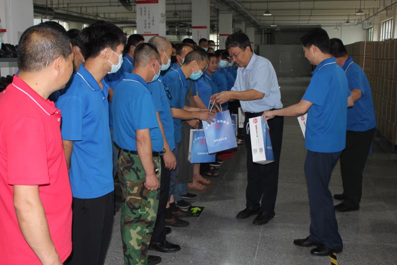 8月7日,威海市總工會黨組成員、經(jīng)審會主任王慶文、辦公室主任趙旭剛在集團公司工會主席鄒曉伍的陪同下,冒著酷暑高溫走進鞋業(yè)公司制鞋七車間,為正在趕制火箭軍專用作戰(zhàn)防護靴等軍品訂單的一線職工送去茶葉、洗化套裝等防暑降溫用品,以表達工會組織對廣大職工的貼心關(guān)懷。