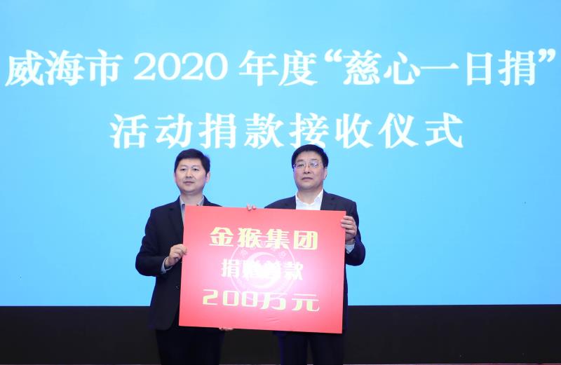 近年來,金猴集團(tuán)在努力做強(qiáng)民族企業(yè),不斷提高職工收入,為國(guó)家多繳稅的同時(shí),不忘履行社會(huì)責(zé)任,積極投身慈善公益事業(yè),先后捐款捐物近3億元,2009年榮獲首屆“山東省慈善獎(jiǎng)——最具愛心捐贈(zèng)企業(yè)”稱號(hào),自2012年起連年獲得“山東民營(yíng)企業(yè)公益之星”殊榮,2016年被授予威海市見義勇為事業(yè)“突出貢獻(xiàn)獎(jiǎng)”,2020年被威海市委、市政府授予“抗擊疫情捐助突出貢獻(xiàn)單位”。