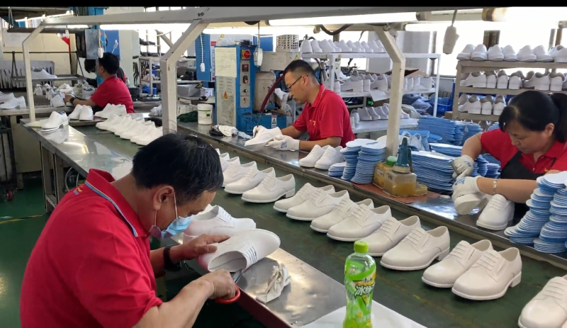每一雙看似簡(jiǎn)潔大方的鞋品里,都飽含金猴集團(tuán)賦予其中的十足“科技感”:采用納米防靜電技術(shù),有效杜絕灰塵污染,讓每一雙白皮鞋保持潔白如云的狀態(tài);采用橡筋布假系帶結(jié)構(gòu),在正常系帶款式部位巧妙使用穿皮條皮工藝;鞋墊底采用具備抑菌除臭吸汗的納米寶麗優(yōu)材質(zhì),同時(shí)在鞋底加入呼吸換氣裝置,讓參會(huì)人員時(shí)刻保持足部干爽清涼。