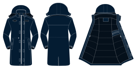 整體顏色為藏青色,款式為中長大衣款式。具有阻燃、防靜電、防水、防風等功能。
