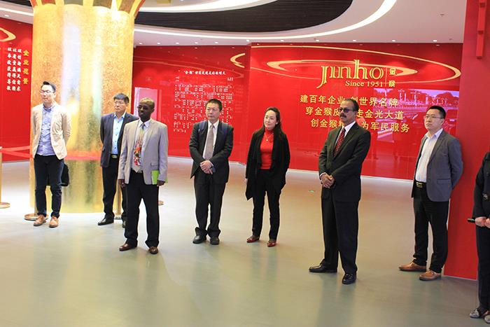 伯哈內(nèi)大使一行認(rèn)真參觀了生產(chǎn)車間制鞋流水線,詳細(xì)了解了內(nèi)銷、出口及軍用皮鞋研發(fā)生產(chǎn)情況,高度贊揚(yáng)金猴皮鞋成功包攬中國(guó)馳名商標(biāo)、中國(guó)名牌產(chǎn)品、中國(guó)真皮領(lǐng)先鞋王、中國(guó)500最具價(jià)值品牌等所有行業(yè)頂級(jí)殊榮,暢銷全國(guó)并出口40多個(gè)國(guó)家和地區(qū),曾多次被全國(guó)部分?。ㄊ校┤舜蟆⒄f(xié)、工會(huì)、團(tuán)委、公安、檢察院、法院、司法、工商、質(zhì)檢、海關(guān)等單位選定為工作用鞋。在膠東(威海)黨性教育基地金猴展陳館,伯哈內(nèi)大使認(rèn)真參觀了企業(yè)文史館和私人定制館,對(duì)公司做好黨性教育基地與工業(yè)旅游示范點(diǎn)相結(jié)合的大文章頻頻點(diǎn)贊。